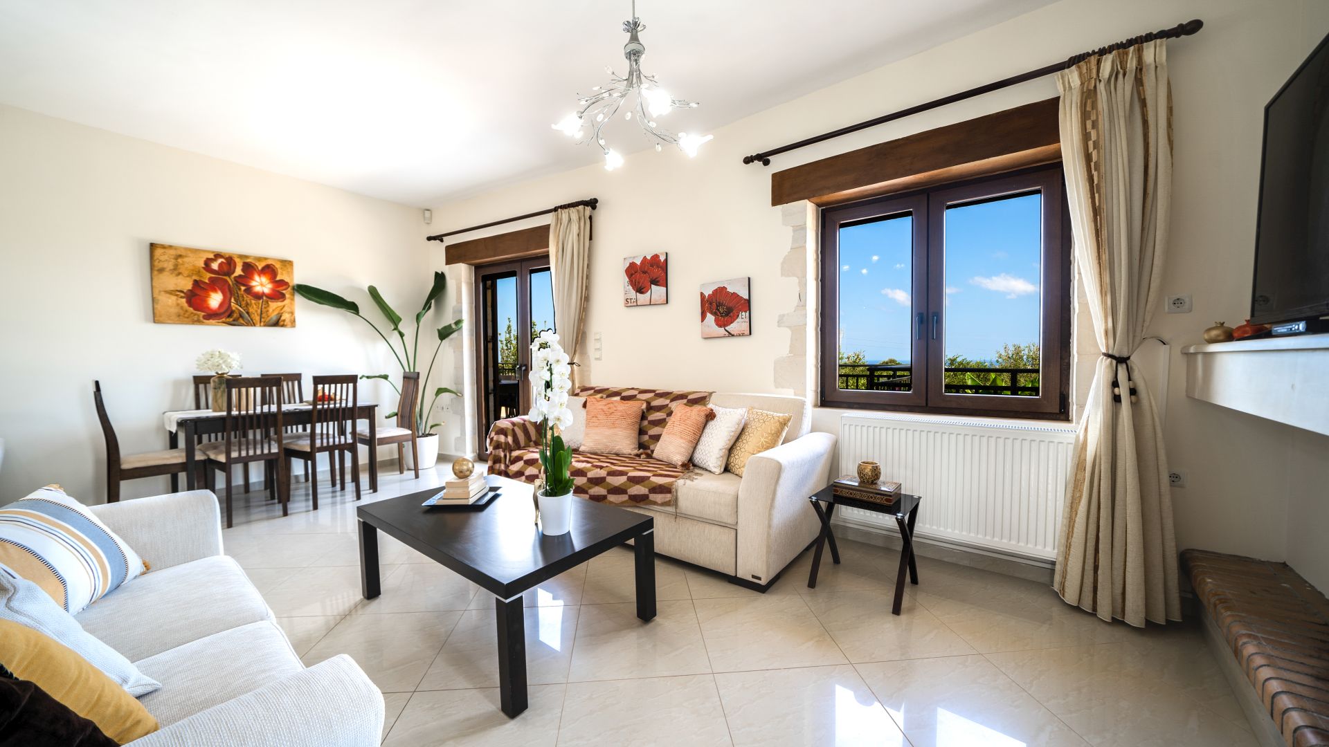 Villa 1 consists comfortable spaces inside, four double bedrooms, living room, dining room, traditional fireplace, two bathrooms, fully equipped kitchen, semi-outdoor area and very large terraces. All rooms have panoramic and unobstructed view of the unique Cretan landscape.